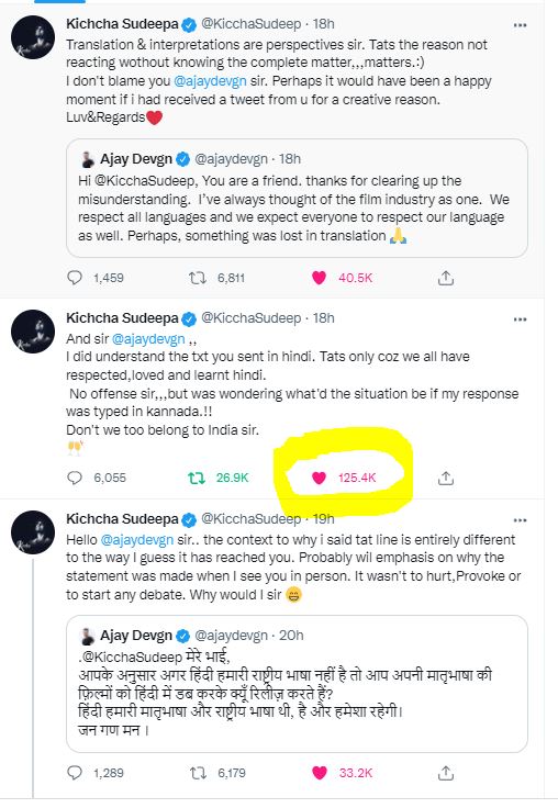 ಅನೇಕ ನಟರು ಮತ್ತು ವಿಶೇಷವಾಗಿ ರಾಮ್ ಗೋಪಾಲ್ ವರ್ಮ ಸುದೀಪ್ ಬೆನ್ನಿಗೆ ನಿಂತಿದ್ದು ಎಲ್ಲರಿಗೂ ಖುಷಿ ತಂದಿದೆ. ಅದರಲ್ಲಿ ಸಮಾರು ಪತ್ರಿಕಾ ಸಂಪಾದಕರು, ಅಂಕಣಕಾರರು ಸುದೀಪ್ ಅವರನ್ನು ಮನಸಾರೆ ಹೊಗಳಿದ್ದಾರೆ. ತಪ್ಪೇ ಮಾಡದ ಸುದೀಪ್ ಅವರ ಜೊತೆ ಜಗಳಕ್ಕೆ ನಿಂತ ವಿಮಲ್ ಸ್ಟಾರ್ ನಾನು ಅರ್ಥ ಮಾಡಿಕೊಂಡಿದ್ದು ತಪ್ಪಾಗಿದೆ ಎಂದು ತೇಪೆ ಹಚ್ಚಿದರು. ತೇಪೆ ಹಚ್ಚುವಕ್ಕಿಂತ ಮುಂಚೆ ದಕ್ಷಿಣದವರ ಅಭಿಪ್ರಾಯ ದೇಶಕ್ಕೆ ಗೊತ್ತಾಗಿದ್ದು ಖುಷಿಯ ವಿಚಾರ! ನಾವೆಲ್ಲ ಭಾರತೀಯರು ಎಂದು ತಿಳಿಕೊಳ್ಳಬೇಕು ಮತ್ತು ಎಲ್ಲ ೨೨ ಅಫೀಷಿಯಲ್ ಭಾಷೆಗಳನ್ನು ಗೌರವ ಕೊಡುವ ಮನೋಭಾವನೆಯನ್ನು ಬೆಳಿಸಿಕೊಳ್ಳಬೇಕು. ಭಾರತ ಕೇವಲ ಹಿಂದಿಯವರದು ಎಂಬ ಮನಸ್ಥಿತಿಯಿಂದ ಹೊರಗೆ ಬರಲೇಬೇಕು! ಹಿಂದಿಯಲ್ಲಿ ಮಾತನಾಡಿದರೇ ಮಾತ್ರ ಭಾರತೀಯರು ಎಂಬ ಸ್ವಯಂ ನಿರ್ಣಯವನ್ನು ಸರಿಮಾಡಿಕೊಳ್ಳಬೇಕು.