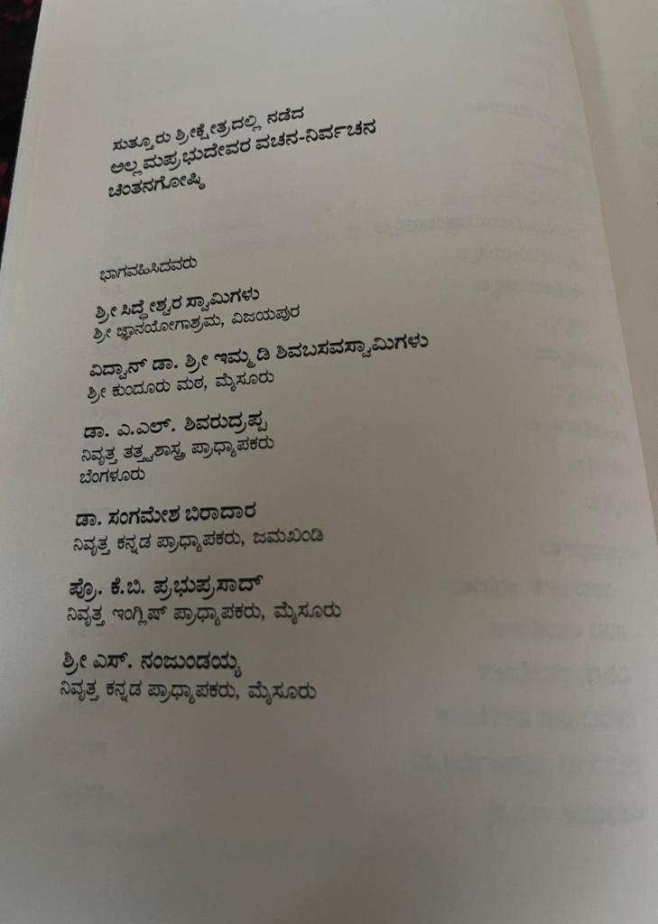 ಆದರೆ ಸುತ್ತೂರ ಶ್ರೀಕ್ಷೇತ್ರದಲ್ಲಿ ನಡೆದ ಅಲ್ಲಮಪ್ರಭುದೇವರ ವಚನ-ನಿರ್ವಿಚನ ಚಿಂತನಗೋಷ್ಠಿಯಲ್ಲಿ ಸಿದ್ದೇಶ್ವರ ಸ್ವಾಮೀಜಿಗಳ ಜೊತೆ , ವಿದ್ವಾನ್ ಡಾಕ್ಟರ್ ಶ್ರೀ ಇಮ್ಮಡಿ ಶಿವಬಸವಸ್ವಾಮಿಗಳು, ಕುಂದೂರ ಮಠ ಮೈಸೂರ್, ಡಾಕ್ಟರ್ ಏ . ಎಲ್. ಶಿವರುದ್ರಪ್ಪ , ನಿವೃತ್ ತತ್ವಶಾಸ್ತ್ರ ಪ್ರಾಧ್ಯಾಪಕರು,ಬೆಂಗಳೂರು, ಡಾಕ್ಟರ್ ಸಂಗಮೇಶ್ ಬಿರಾದಾರ್, ನಿವೃತ್ ಕನ್ನಡ ಪ್ರಾಧ್ಯಾಪಕರು, ಪ್ರೊ ಕೆ ಬಿ ಪ್ರಭುಪ್ರಸಾದ್ , ನಿವೃತ್, ಇಂಗ್ಲಿಷ್ , ಪ್ರಾಧ್ಯಾಪಕರು, ಮೈಸೂರ್ ಮತ್ತು ಶ್ರೀ ಎಸ್ . ನಂಜುಂಡಯ್ಯ ,ನಿವೃತ್ ಕನ್ನಡ ಪ್ರಾಧ್ಯಾಪಕರು, ಮೈಸೂರ್ ಅಲ್ಲಮರ ವಚನವನ್ನು ನಿರ್ವಿಚನ ಮಾಡಿ ಅದಕ್ಕೆ “ಅಲ್ಲಮ ಪ್ರಭುದೇವರ ವಚನ ನಿರ್ವಿಚನ” ಎಂಬ ಪುಸ್ತಕವನ್ನು ಬರೆದರು. ಅನೇಕ ಆಧ್ಯಾತ್ಮಿಕ ಜೀವಿಗಳು ಪುಸ್ತಕ ಓದಿದ ಮೇಲೆ ಹೇಳಿದ್ದು ಒಂದೇ “ಅಲ್ಲಮರ ವಚನಗಳನ್ನು ನಿರ್ವಚನ ಮಾಡಲು ಸಾಧ್ಯವಾಗಿದ್ದು , ಮತ್ತೊಮ್ಮೆ ಅಲ್ಲಮರಾಗಿ ಹುಟ್ಟಿಬಂದ ಸಿದ್ದೇಶ್ವರ ಮಹಾಸ್ವಾಮಿಗಳಿಂದ “